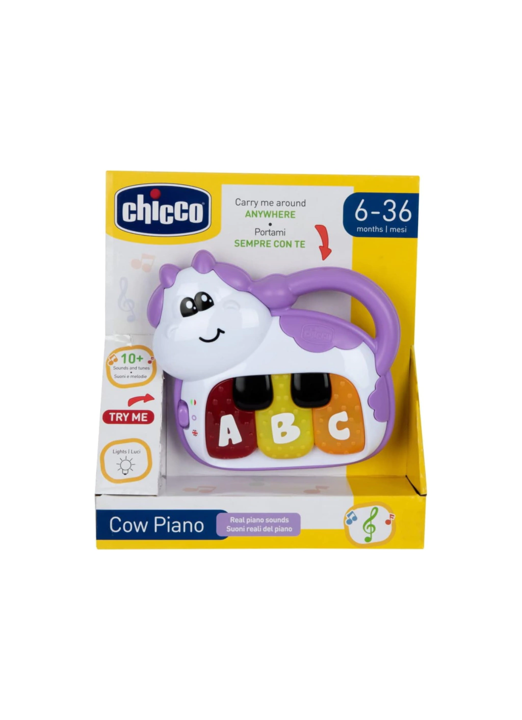 Es un divertido piano con forma de vaca con 12 sonidos y melodías relacionadas con la música y el piano. A través de 3 teclas de piano con divertidos sonidos y efectos con luces. Además, podes elegir entre el español o el ingles para enseñar a tu bebé palabras en ambos idiomas