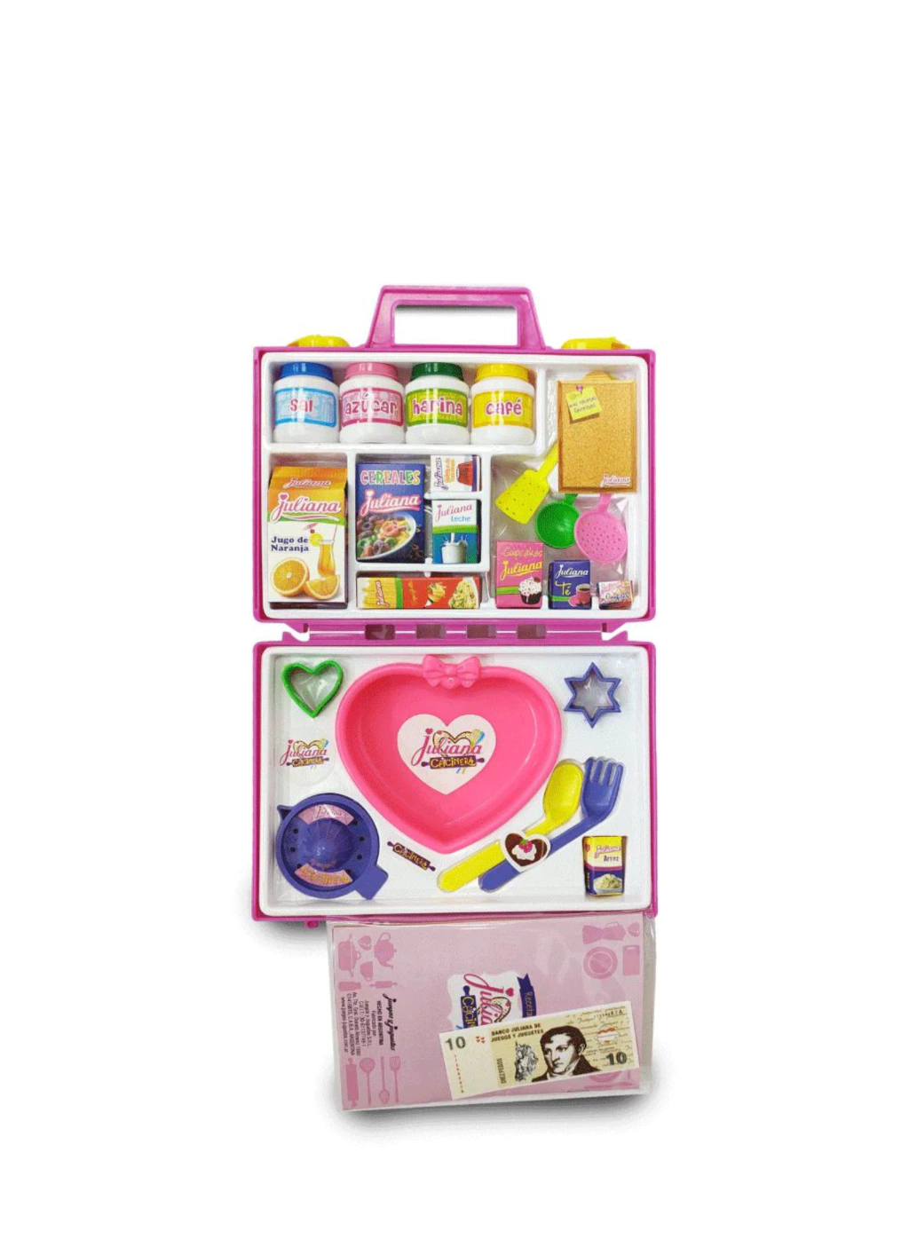 A partir de 3 años, ¡la valija ideal para los mini chefs! Esta valija viene repleta de sorpresas y herramientas para que los más chicos se diviertan en la cocina. Incluye potes de azúcar, harina, café y sal, mini cubiertos, un plato en forma de corazón, cortantes de plástico y mucho más. Además, trae un juguero y una caja realista de cereales, gelatina, jugo de naranja, fideos, cupcakes, té, confites y arroz. ¡Pero eso no es todo! También contiene un recetario con consejos sobre cocina, pirámide nutricional y recetas de jugos, wraps, chipas, cheesecake y muchas delicias más. ¡Listos para cocinar y aprender jugando!